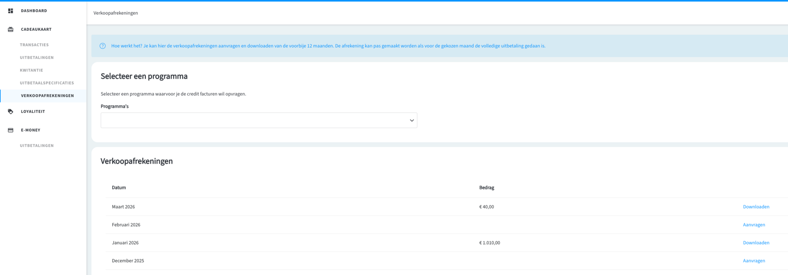 • Nieuwe pagina Verkoopafrekeningen toegevoegd. Je kan hier de verkoopafrekeningen aanvragen en downloaden van de voorbije 12 maanden. Deze pagina is enkel beschikbaar voor verkooppunten.